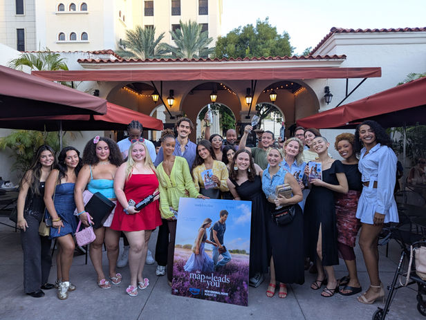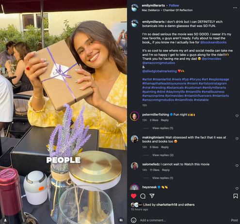 Our guests started the evening at Books & Books, an iconic and beautiful bookstore, in Coral Gables. They received their own personal copy of the book the film is based on and enjoyed a selection of wine and light bites inspired by the European setting of the film. Then, in the spirit of the film's main character appreciating the illustrations his grandfather left him in an old journal passed down through the generations, guests used custom engraving tools to etch designs into their complimentary wine glasses and bottles. Once the sun began to set, we made our way over to the historic Coral Gables Art Cinema for an exclusive advance screening of the film, hosted by bookstagram influencer @bookedblonde.