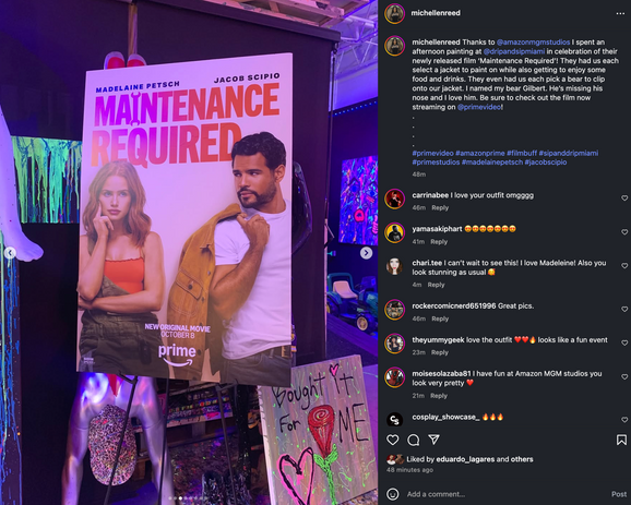 Guests were invited to a hidden gem within the heart of Wynwood, Drip and Sip Miami, for an evening of denim jacket customization and refreshments. Each influencer chose a jacket to their liking and was provided with all the art materials they could desire. Over the course of the evening, we encouraged them to let their creativity run wild, and saw some truly unique designs come to life. The posts they shared on their socials, highlighting the event and encouraging their followers to check out the film on Prime, had an estimated reach of 1.1 million.