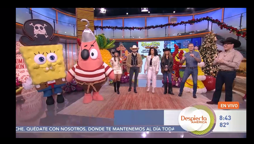 SpongeBob and Patrick took a break from Bikini Bottom to visit Miami, where they participated in a media day at local CBS, NBC, and Telemundo stations. Their appearances ran on Univision's Despierta America, La Voz de la Manana, En Casa con Telemundo, Revoltillo Digital, and South Florida Live. They stopped by two screenings while in town, an advance screening hosted by on-air personality Alan Tacher, of Univison's Despierta America, and another for the Miami Dolphins charity foundation with star player Jack Jones.